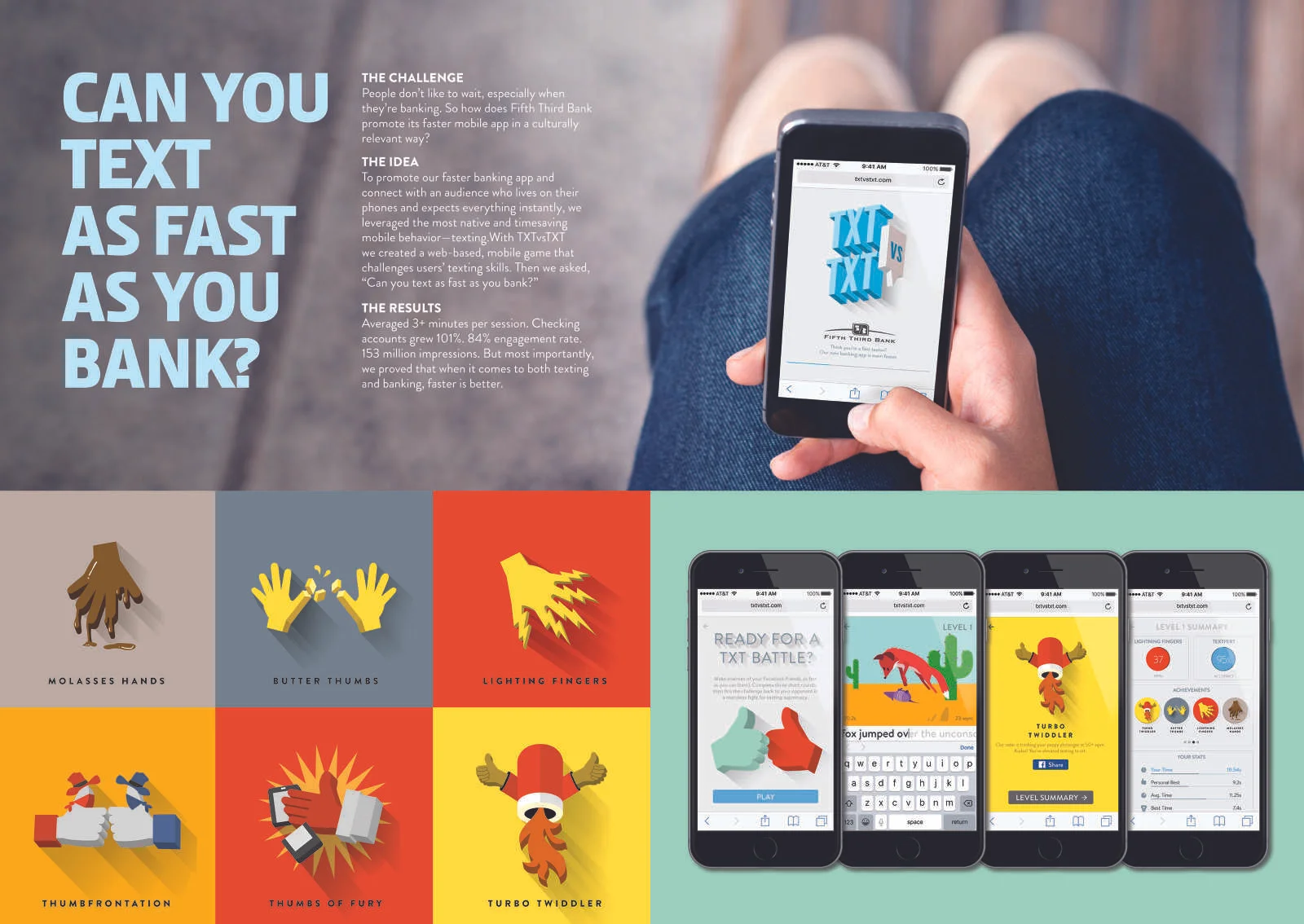 We created an animated mobile texting game to promote Fifth Third Bank's faster mobile app. The game connected with a user's Facebook ID so users could challenge their friends or battle others in a live text duel, completing levels with unique sentences and campy moving animations.
